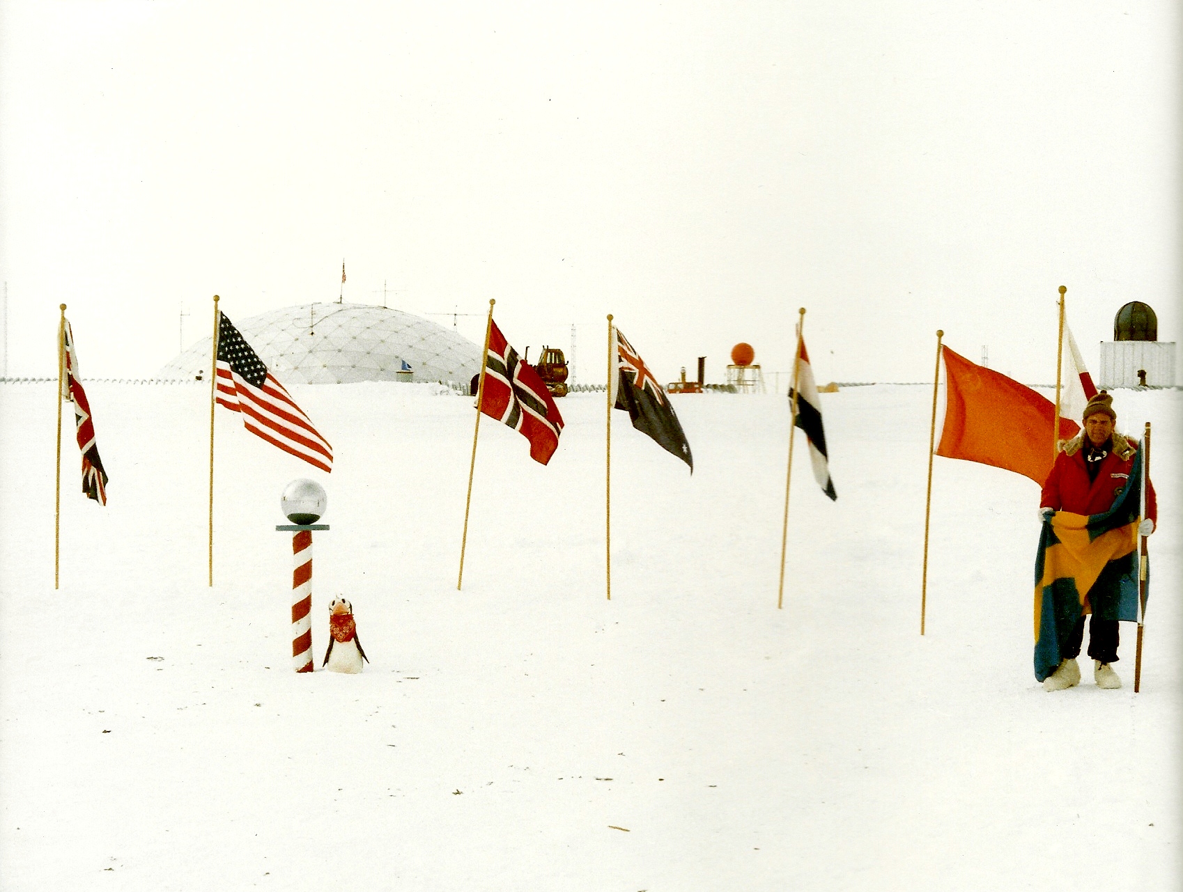 Det var den frejdade norske polarforskaren Roald Amundsen som först nådde Sydpolen den 14 december 1911, fem veckor för britten Robert Scott. Den stora vetenskapliga basen på själva geografiska Sydpolen Amundsen-Scott-basen är uppkallad efter dessa två ”första forskare” som nådde Sydpolen. Själv besökte jag geografiska Sydpolen och Amundsen-Scott-basen den 10 januari 1985 som svensk officiell representant, varvid jag för svensk räkning placerade den svenska flaggan på Sydpolen som en markering av Sveriges pånyttfödda intresse för Antarktis och det svenska inträdet i 1959 års Antarktisfördrag (se bilden), vilket alltså bidrar till att stabilisera förhållandena på Antarktis och hålla de aktuella suveränitetskraven ”vilande”. Saken kompliceras av att Sovjetunionen/Ryssland inte hade/har några ”sektorkrav” på Antarktis men väl ett stort intresse för närvaro på kontinenten.