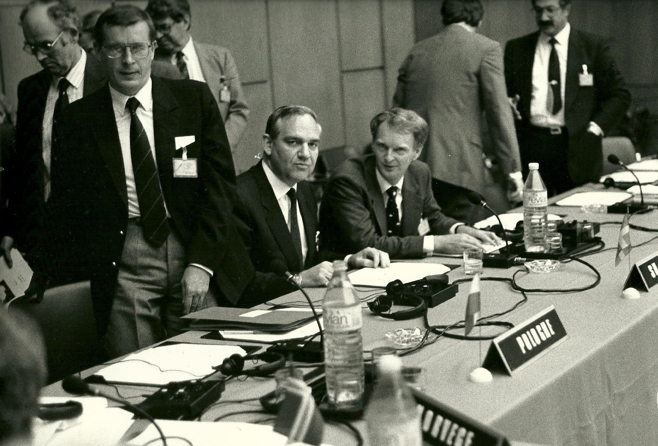 Bilden är från de konsultativa Antarktisstaternas fördragsmöte i Paris den 21 september 1988 då Sverige upptogs som konsultativ (styrande) stat i 1959 års Antarktisfördrag. Jag ledde den svenska delegationen och bredvid mig sitter professor Anders Karlquist, Chef för det Svenska Polarforskningssekretariatet. Vi var ”två parhästar” som tillsammans med flera andra drev åt samma håll, varför vi lyckades med konststycket att tidigt ta in Sverige i Antarktisfördraget. Detta var mitt sista uppdrag i UD, varefter jag lämnade ”för alltid”.