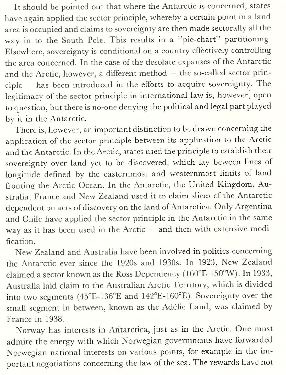 I min bok Folkrätt och säkerhetspolitik skriver jag följande om användningen av sektorprincipen för Arktis och Antarktis vidkommande, där jag påpekar att användningen av sektorprincipen för Arktis vidkommande från första början gällde ”suveränitetskrav” över ännu icke upptäcka öar eller landområden inom den s k sektorn. Principen gällde alltså inte alls suveränitetskrav över det öppna havet/Oceanen bortom de allmänt erkända tämligen smala territorialhaven. Det är också på det sättet som sektorprincipen kom att användas för Antarktis vidkommande, alltså ”krav” över antarktiskt landområde (eftersom Antarktis är en kontinent).