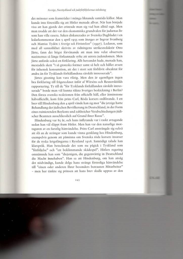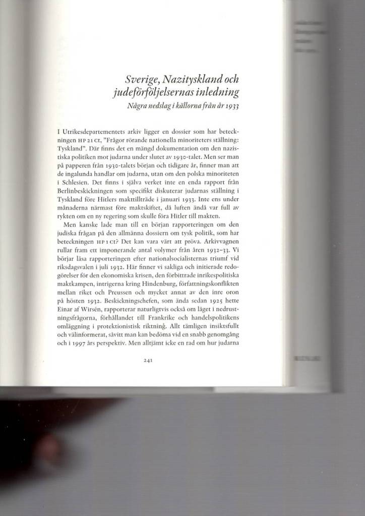 Texten ur kapitlet Sverige, Nazityskland och judeförföljelsernas inledning – några nedslag i källorna från år 1933 (sid 241-249, se nedan) återges här med tillstånd av Santérus förlag. Se länk https://santerus.se/fred-och-sakerhet-i-tider-av-forandring-bok-40.html