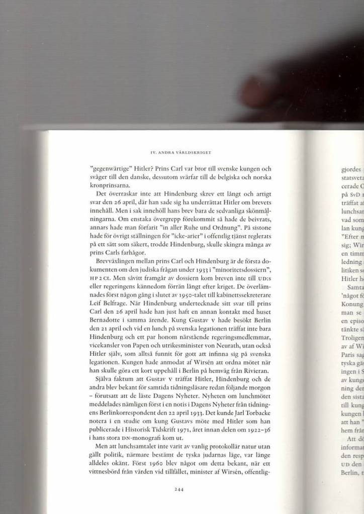 När Hindenburg undertecknade sitt svar till prins Carl den 26 april 1933 hade han just haft en annan kontakt med huset Bernadotte i samma ärende. Kung Gustav V hade besökt Berlin den 26 april 1933 och vid en lunch på svenska legationen träffat inte bara von Hindenburg — vicekansler von Papen och utrikesminister von Neurath, utan också HITLER själv, som alltså funnit för gott att infinna sig på svenska legationen. Kungen hade anmodat (beskickningschefen) af Wirsén att ordna ett möte när han skulle göra ett kort uppehåll i Berlin på vägen hem från Rivieran. —