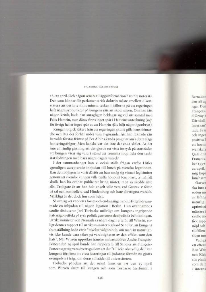 I ett skede där, som sagt, den politiska brunsmetningen drabbar kungahuset är det ändå synnerligen intressant att den svenske kungen Gustav V med kort varsel i Berlin 1933 kunde ”sammankalla” den tyska riksledningen inklusive Hitler i syftet att inför Hitler personligen starkt kritisera en av Nazismens mest symboliska frågor, nämligen judeförföljelserna. Hitler lyssnade tydligen på den svenske kungen. Vad denna episod i Berlin de facto indikerar har väl antagligen stor betydelse i förklaringen varför Hitler ”lät Sverige – som enda land – slippa ett tyskt angrepp”. Kung Gustaf V:s roll under kriget har egentligen aldrig helt klarlagts.