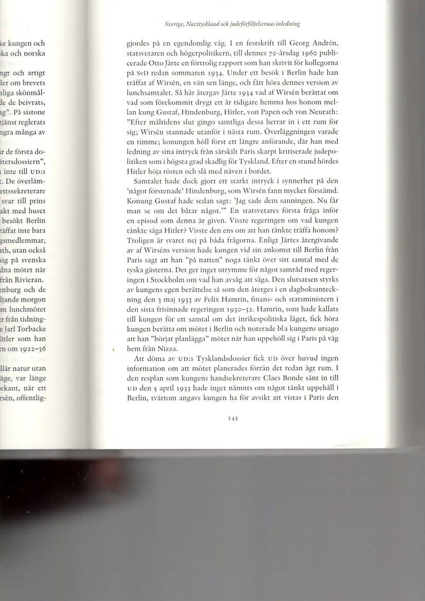 Men att lunchsamtalet inte varit av vanlig protokollär natur utan gällt politik, närmare bestämt de tyska judarnas läge, var länge alldeles okänt. Först 1960 blev något av detta bekant, när ett vittnesbörd från värden vid tillfället, minister af Wirsén, offentliggjordes på en egendomlig väg. I en festskrift till Georg Andrén ´, statsvetaren och högerpolitikern, till dennes 70-årsdag 1960, publicerade Otto Järte en förtrolig rapport som han skrivit för kollegorna på SvD redan sommaren 1934. Under ett besök i Berlin hade han träffat af Wifrsén, en vän sedan länge, och fått höra dennes version av lunchsamtalet mellan kung Gustaf och Hitler. Så här återgav Järte 1934 vad af Wirsén berättat om vad som förekommit drygt ett år tidigare hemma hos honom mellan kung Gustaf, Hindenburg, Hitler, von Papen och von Neurath: