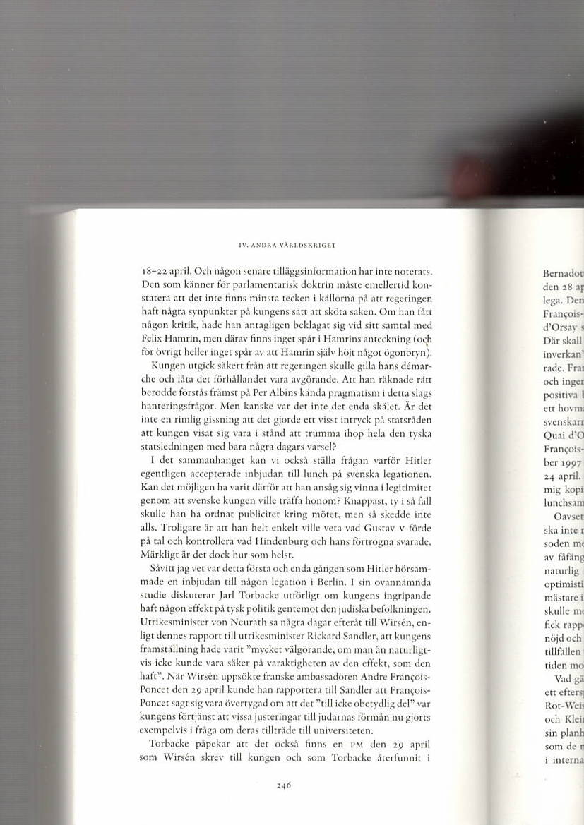 När Hindenburg undertecknade sitt svar till prins Carl den 26 april 1933 hade han just haft en annan kontakt med huset Bernadotte i samma ärende. Kung Gustav V hade besökt Berlin den 26 april 1933 och vid en lunch på svenska legationen träffat inte bara von Hindenburg — vicekansler von Papen och utrikesminister von Neurath, utan också HITLER själv, som alltså funnit för gott att infinna sig på svenska legationen. Kungen hade anmodat (beskickningschefen) af Wirsén att ordna ett möte när han skulle göra ett kort uppehåll i Berlin på vägen hem från Rivieran. —