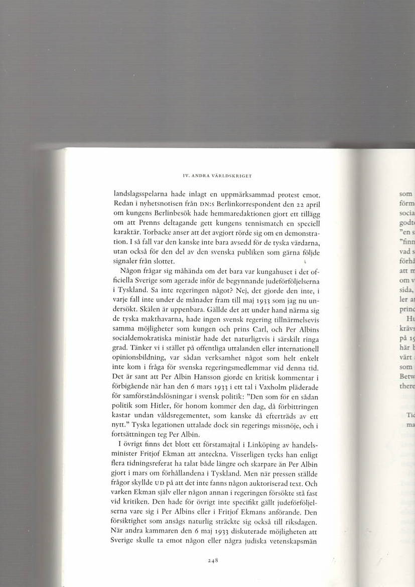 I ett skede där, som sagt, den politiska brunsmetningen drabbar kungahuset är det ändå synnerligen intressant att den svenske kungen Gustav V med kort varsel i Berlin 1933 kunde ”sammankalla” den tyska riksledningen inklusive Hitler i syftet att inför Hitler personligen starkt kritisera en av Nazismens mest symboliska frågor, nämligen judeförföljelserna. Hitler lyssnade tydligen på den svenske kungen. Vad denna episod i Berlin de facto indikerar har väl antagligen stor betydelse i förklaringen varför Hitler ”lät Sverige – som enda land – slippa ett tyskt angrepp”. Kung Gustaf V:s roll under kriget har egentligen aldrig helt klarlagts.